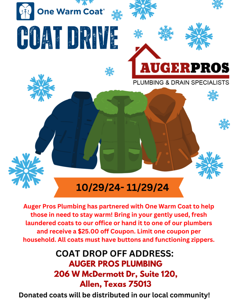 Auger Pros Plumbing has partnered with One Warm Coat to help those in need to stay warm! Bring in your gently used, fresh laundered coats to our office or hand it to one of our plumbers and receive a $25.00 off Coupon. Limit one coupon per household. All coats must have buttons and functioning zippers. Help us reach our goal with this Auger Pros Coat Drive!