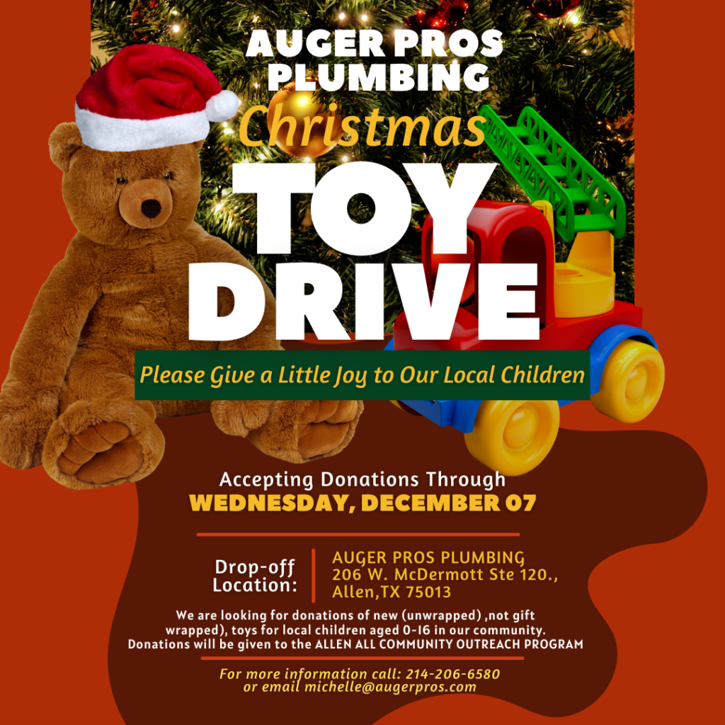 Auger Pros Plumbing & Drain is partnering with ACO, the All Community Outreach in Allen to be a drop-off location for unwrapped toys for the Children of the Allen, Texas Community. Auger Pros Plumbing Toy drive will be starting 11-18-22 and ending 12-7-22 so the ACO elves can sort and distribute the gifts.